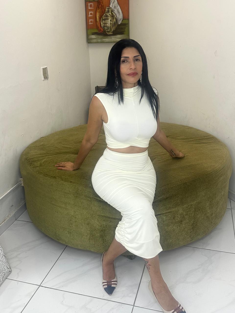 Este conjunto é a escolha perfeita para quem busca um visual monocromático moderno, sofisticado e com um toque de ousadia. A combinação do top estruturado com a saia drapeada cria uma silhueta alongada e extremamente feminina, ideal para eventos sociais, festas ou ocasiões que pedem um look marcante.